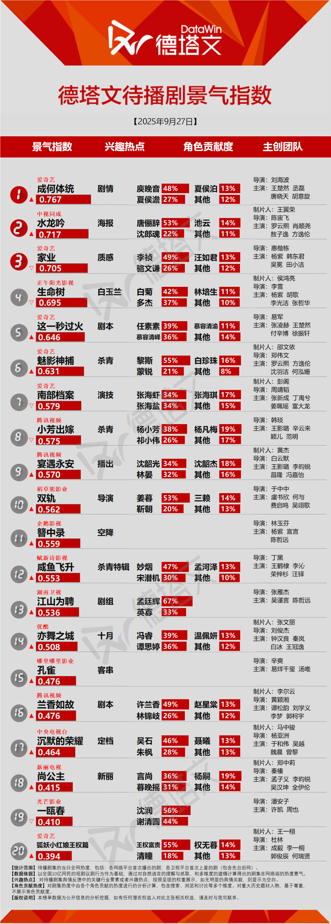 成何体统(庾晚音48% 夏侯澹27%) 水龙吟(唐俪辞53% 沈郎魂22%) 家业(李祯49% 骆文谦26%) 生命树 这一秒过火 魅影神捕 南部档案 小芳出嫁 宴遇永安 双轨 簪中录 咸鱼飞升 江山为聘 亦舞之城 孔雀 兰香如故 沉默的荣耀 尚公主 一瓯春 狐妖小红娘王权篇