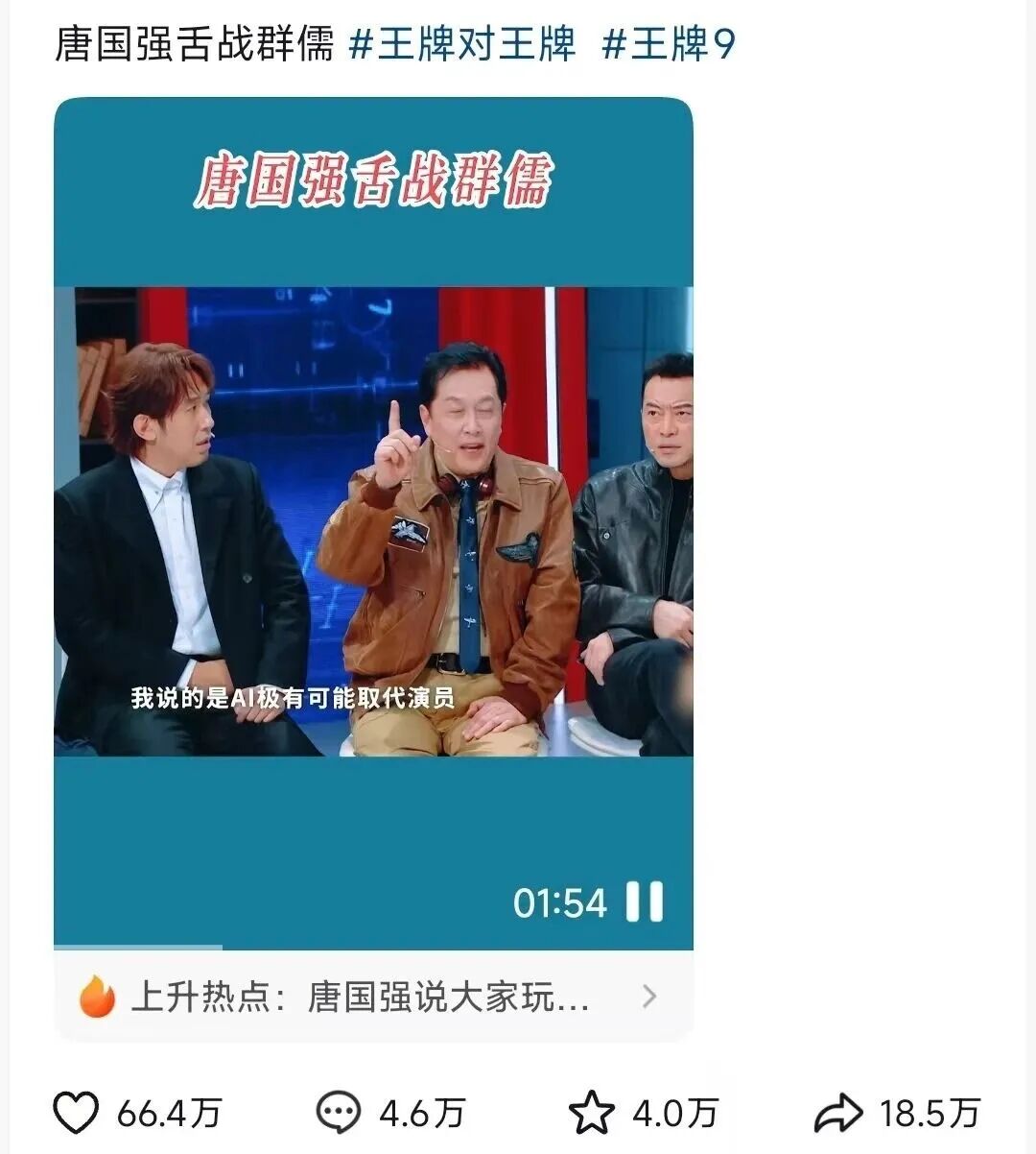 很多网友戏称,唐国强老师估计也看多了关于自己的AI二创,才对AI有这么强的信心。