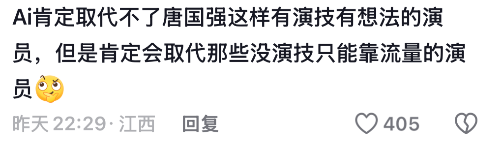 而且相当讽刺的是,虽然很多人支持唐国强的「AI取代演员」的观点,但未必有很多人支持AI取代唐国强和梁朝伟。